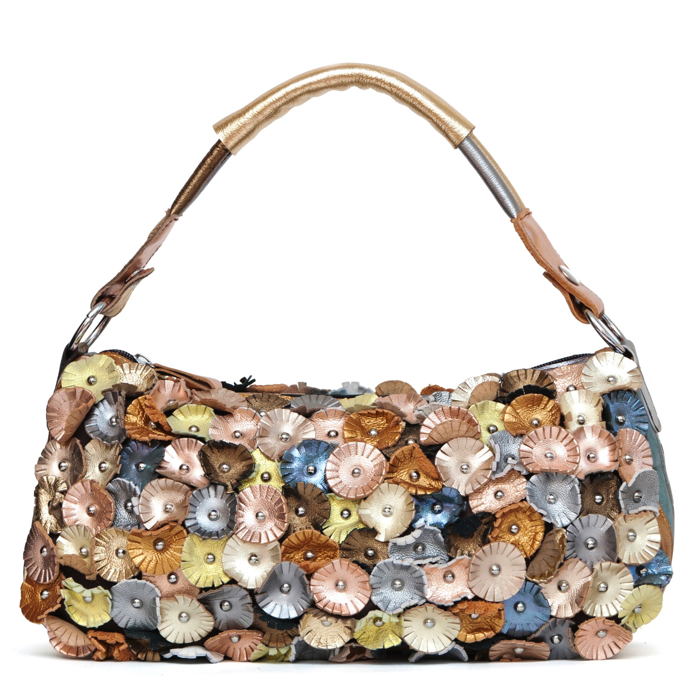 Описание: Золото - хит, хит, хит! Обувные магазины полны золотой обувью, и найти сумку к новым золотым туфлям или сапогам очень сложно! А эта чудесная маленькая невесомая сумочка подойдет к любой покупке: в ней гармонично сочетается 6 разных оттенков золота! Очень приятно взять ее в руки, ведь сделана эта сумка из натуральной овечьей кожи, знаменитой своей мягкостью и легкостью. А вы только посмотрите на цену!