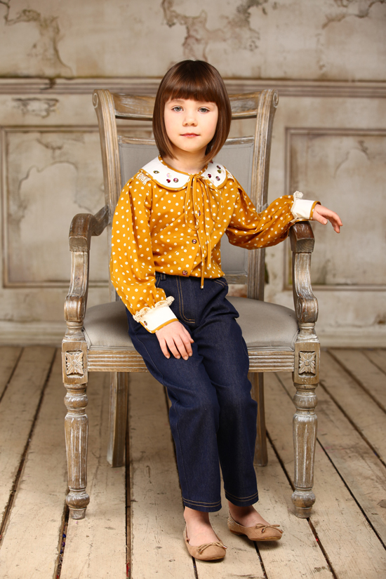 39.1314.9 Блузка горчичная в горошек со съемным воротничком и стразами р. 146 см. 870,00 3,000