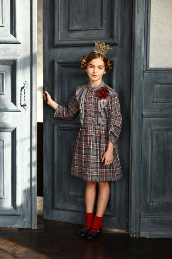 16.1314.3 Платье из серого хлопка << крэш>> в клетку с трикотажной оборкой и цветком-брошью р.110 см. 1 140,00 3,000