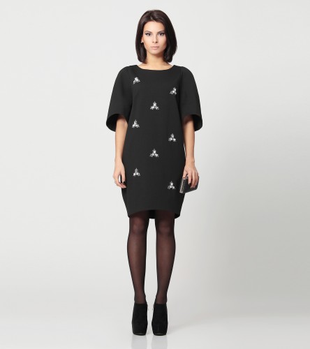 Описание: Платье женское-кокон. Этот наряд имеет интересный крой, и необычные расширеные рукава. Платья для раскрепощенных и прогресивных модниц, которые не боятся смелых решений. Спереди платье украшает множество сияющих страз. Если вы хотите выглядеть на Новый год как королева, вам стоит обратить внимание на это потрясающее платье от Prio.