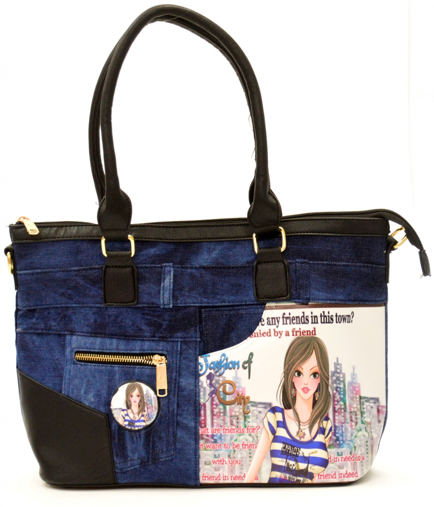 Сумочка выполнена под синий деним "мятый бархат", стильно украшена аппликациями и небольшим функциональным кармашком. Оригинальную модель гармонично дополняют шесть квадратных колец, к четырём из которых крепятся прочные ручки, а к двум боковым съёмный ремень, для ношения на плече.