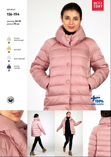 Оригинальная зимняя куртка с наполнителем из гусиного пуха. У модели отсутствует капюшон и довольно короткая длина, поэтому она подойдет для активных занятий спортом (лыжами, фигурным катанием). Леди, передвигающихся на собственном автомобиле, тоже оценят куртку по достоинству. У модели простой прямой крой, горизонтальная простежка, рукав-реглан, объемный воротник-стойка и замечательный цветовой ряд, в котором присутствуют, как привычный горожанкам темно-синий цвет, так и теплый желтый, а также нежные молочный и жемчужный.