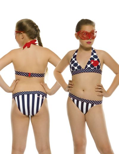 Раздельный купальник для девочек младшего и среднего школьного возраста. Бюст - мягкие фиксированные треугольники на галстучных завязках и широком эластичном пояске с выходом на застёжку. Плавки - танга на широком поясе средней посадки. Модель данной серии имеет сложное дизайнерское решение, так как на одной базовой основе создано два креативных изделия. Вариант 1 - выполнен в комбинации двух геометрических принтов синего цвета с ярко-красной контрастной отделкой. Оригинальная ручная вышивка "Пылающее сердце" блестящими паетками красного цвета на левой чашечке бюста отличительная деталь варианта 1. Модельный ряд выполнен в стиле "Пин Ап" ретро 50-х.