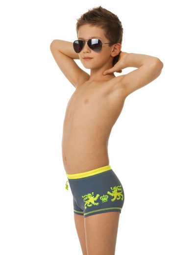 Оригинальные плавки-шорты для мальчиков младшего возраста. Классическая модель с широким эластичным поясом, контрастной отстрочкойи шнурком потайного типа по линии талии для лучшей фиксации на фигуре. Шорты выполнены из классической матовой лайкры в технике поместного принта, в стиле ''Рыцарская геральдика".