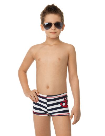 Плавки-шорты для мальчиков младшего возраста комфортной посадки. Шнурок по талии потайного типа для лучшей фиксации на фигуре. Модельный ряд выполнен в классическом стиле - "Морской Яхт-клуб". Изделие представлено из ткани в крупную полоску синего цвета и декорировано крупной морской символикой "Красный якорь" и фирменным логотипом серии в технике "рабл принт".