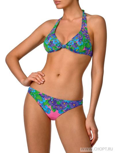 Оригинальный молодёжный купальник из двух предметов. Бюст - треугольное бандо на широких галстучных завязках и декоративным галстуком по центру. Плавки средне низкой посадки со средним бочком. Купальник выполнен в стиле поместного размещения принта, из деликатной микрофибры с матовым эффектом.