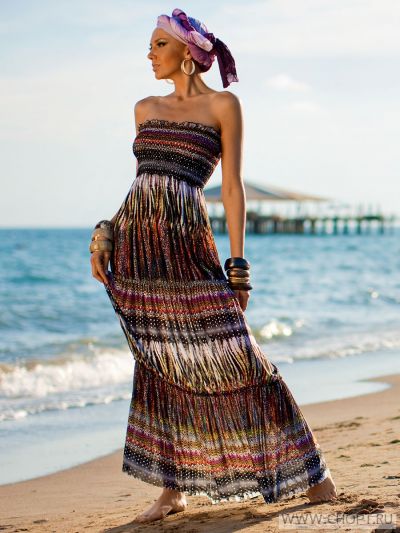 Популярный пляжный сарафан с густо драпированной кокеткой, многослойными воланами длиною в пол. Модель выполнена из мягкой эластичной сетки, которая очень практична в использовании на песочных и каменистых пляжах, у бассейнов и на море. Она устойчива к загрязнениям, не сминается, быстро высыхает. Не выцветает на солнце и в воде.